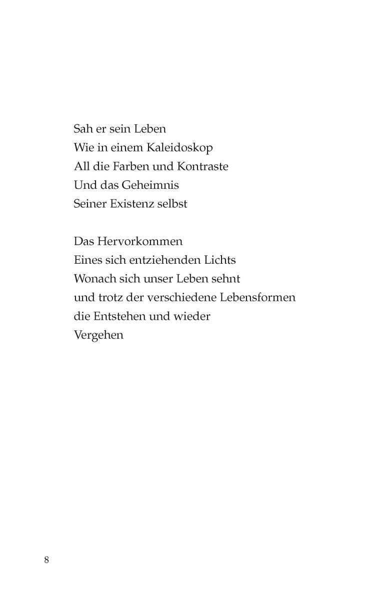 Bernd Rosenkranz verfasst lyrische Texte, die einer oralen, philosophischen und poetischen Reflexion entsprungen sind, in zeitlicher Abfolge aus unterschiedlichsten Situationen. So erscheint es nicht verwunderlich, wenn die Themen ganz verschiedene sind. Immer entstammen sie aber momentanen Empfindungen und Gedanken. Sie sind aufgezeichnet wie Perlen auf einer Kette und ohne Titel niedergeschrieben. Es geht dabei um existenzielle Erfahrungen, den Anbeginn des Tages, das Heraufkommen des Lichtes, die durchwachten Nächte.