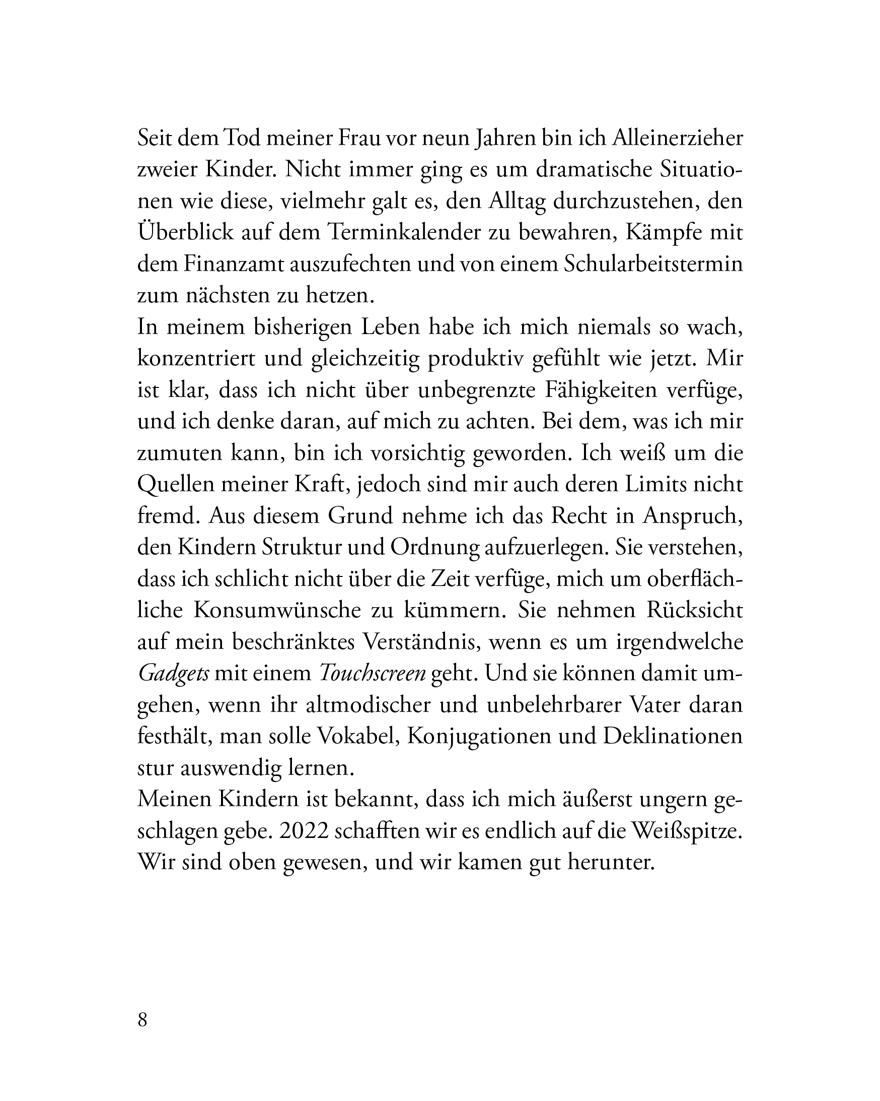 Dieses Buch handelt von Kindern, Hühnern und Büchern. Ein Journal aus dem Leben eines alleinerziehenden Vaters mit zwei Kindern und bis zu sieben Hühnern, abhängig davon, ob uns der Fuchs wieder einmal mit seinem Besuch beehrt hat. Die kleinen Freuden und billigen Triumphe und das große Ach und Weh, tiefsinnige Gedanken über die Welt und das mühsame Dasein auf ihr – jedenfalls schrecklich unsortierte und unfrisierte Geschichten.